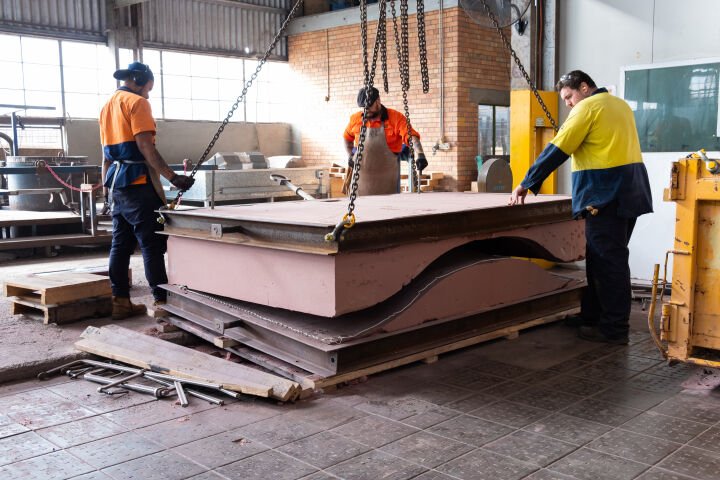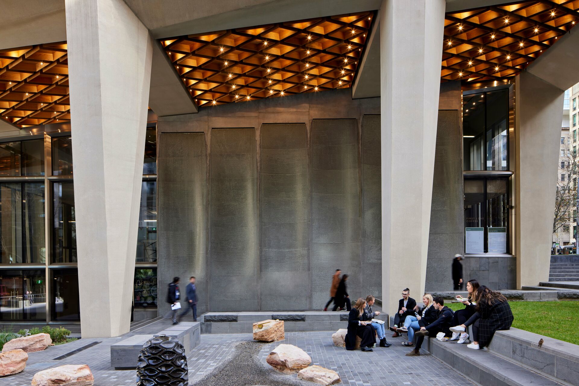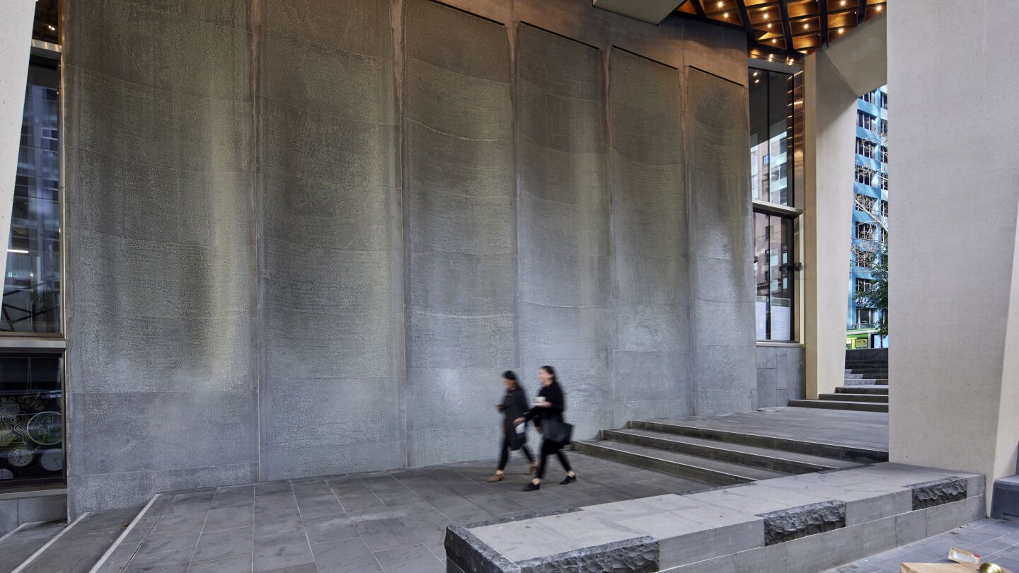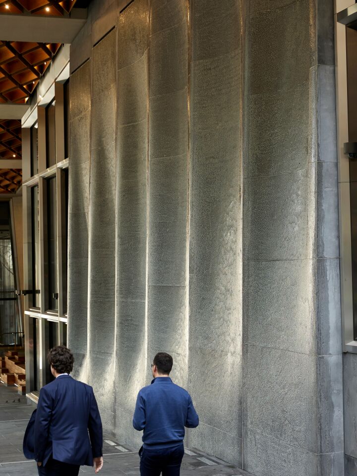 Fabricated in UAP’s Brisbane foundry in cast aluminium with a unique textural finish, the water wall consists of a series of concave and curved planes with water running down the surface. Acting as a hybrid between architectural intervention and fountain, the water wall becomes a moment where the public engage with the building’s surface in a tactile way.
