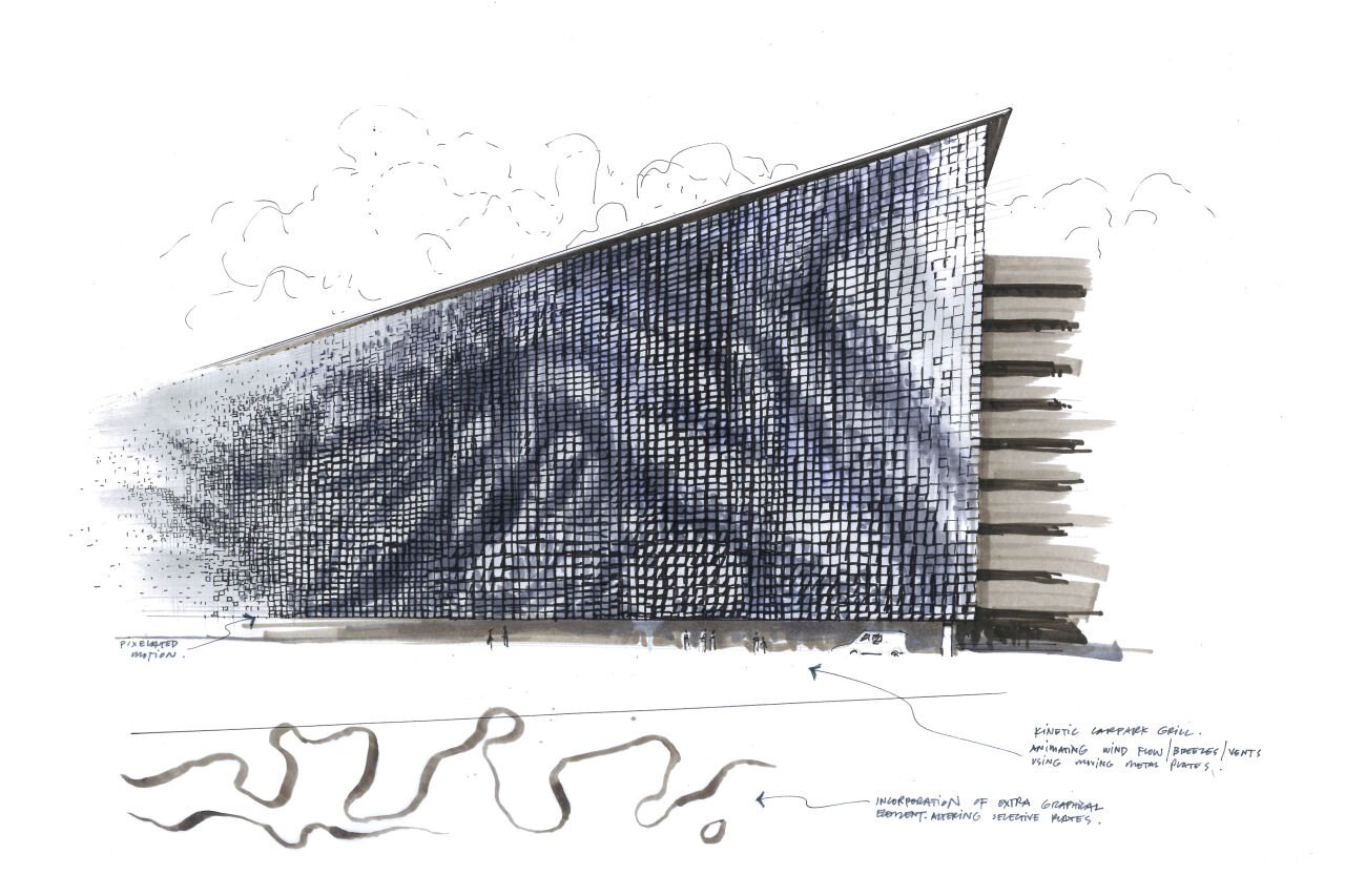 San Francisco based artist Ned Kahn is renowned for his large-scale sculptures that incorporate natural elements. In 2012, Kahn was appointed through a competitive selection process to create an eight storey, 5000 square meter kinetic façade, Turbulent Line.
