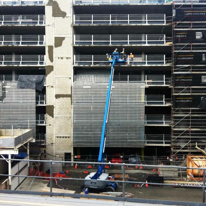 Inside the car park, patterns of light and shadow project onto the walls and floor as sunlight passes through the façade. The design also provides practical environmental benefits such as shade and natural ventilation. This large-scale work creates a mesmerising impression for passengers emerging from the terminal, arriving by car, or on the elevated Airtrain platform.