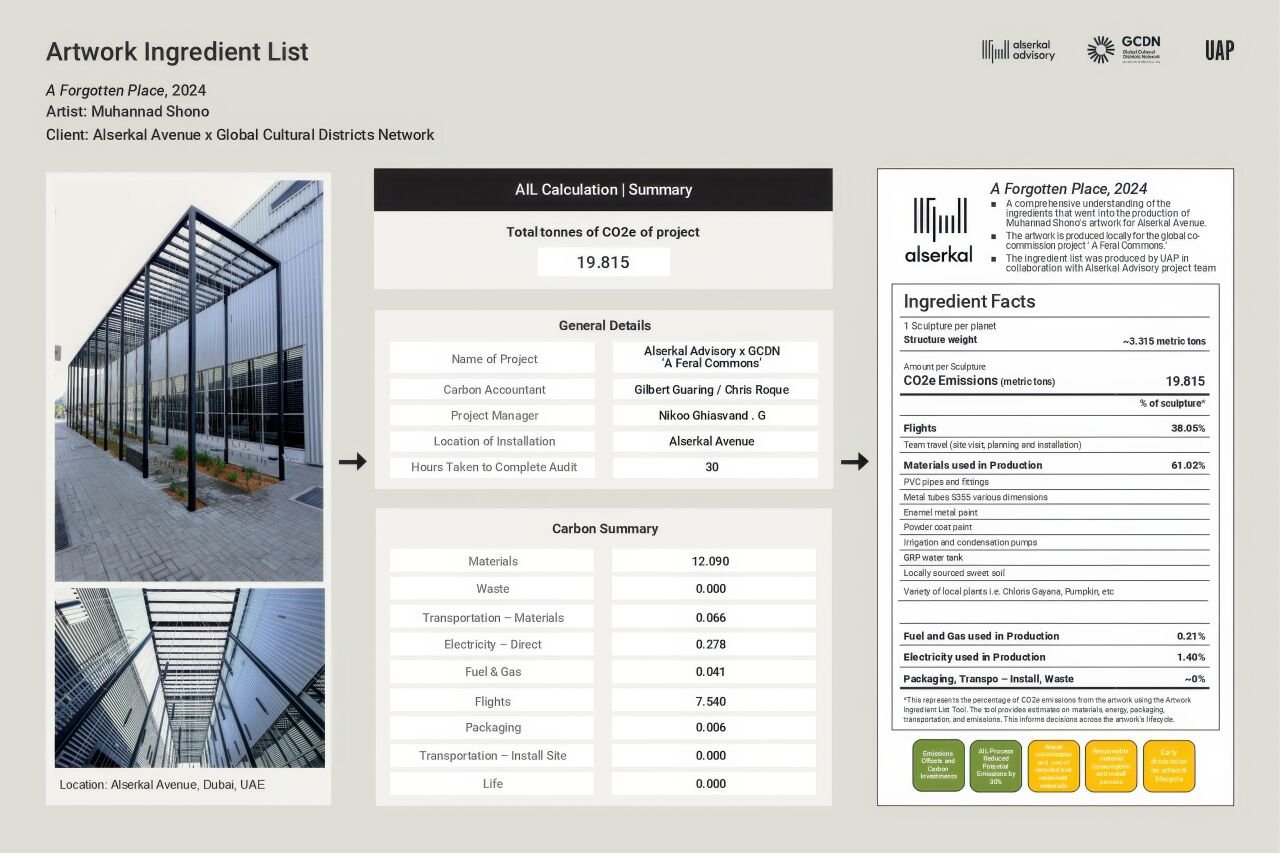 This Global Co-Commission, titled A Feral Commons, curated by Tairone Bastien, is an initiative by Alserkal Advisory in collaboration with GCDN (Global Cultural Districts Network) and supported by UAP. The commission spans three cultural districts across three continents: Alserkal Avenue, Dubai (UAE), Victoria Yards, Johannesburg (South Africa), and Kingston Creative, Kingston (Jamaica).In developing an initiative focused on contextualising the global climate crisis and driving collective action, the Global Co-commission has used our proprietary tools to help measure the impact of public art. This includes providing a framework to audit the project’s CO2 emissions and tracking and reporting on the societal impact and afterlife of the three commissions in each of the participating districts.