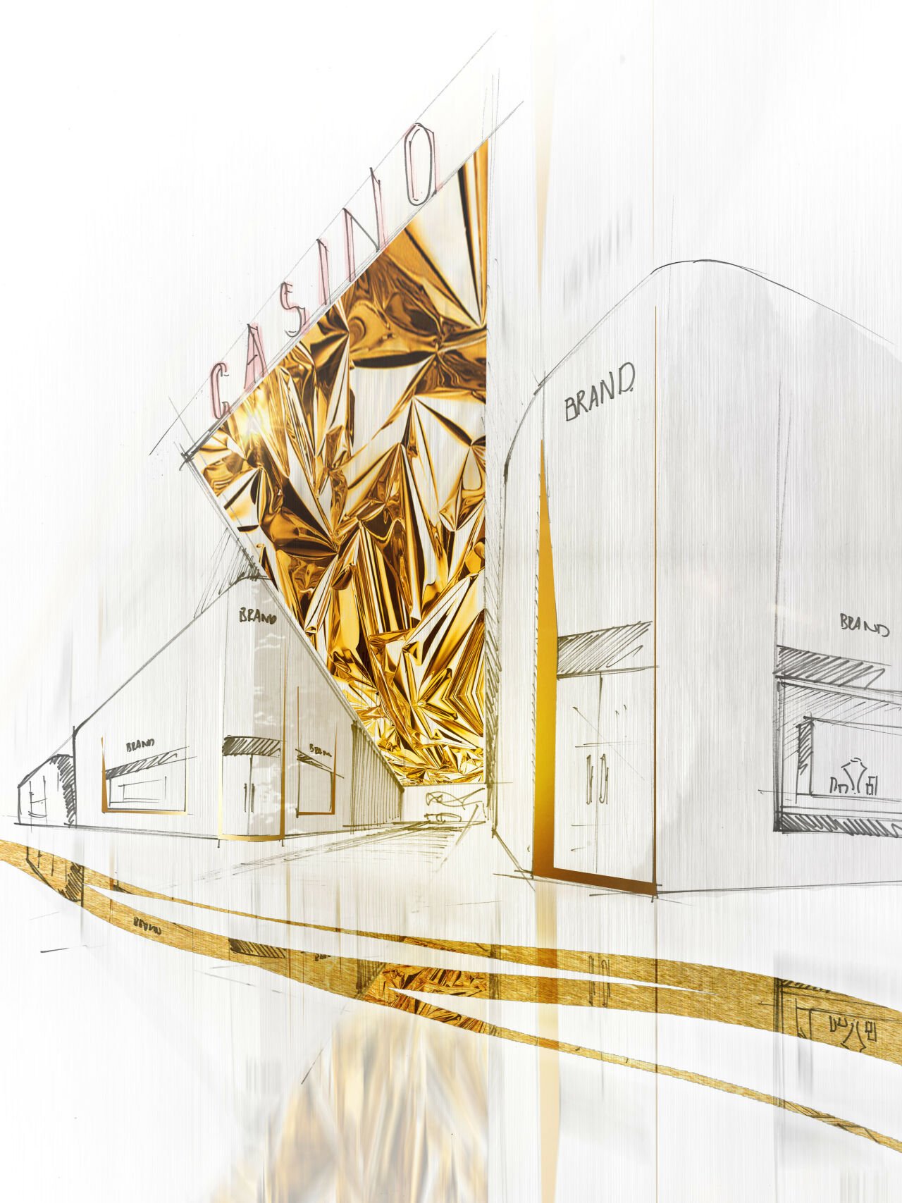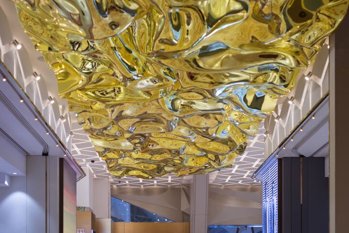 Creating visuals of liquid-gold floating through a 17m long entry space, French creative agency Malherbe Paris collaborated with UAP to deliver this interior ceiling canopy for Morpheus Hotel in Macau, China.