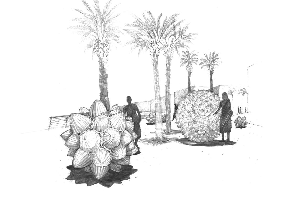Marcus’ internally lit sculptures are positioned to match the Delphinus constellation documented by astronomer Abd Al-Rahman Al-Sufi over 1000 years ago and guide pedestrians through the Sea court area.