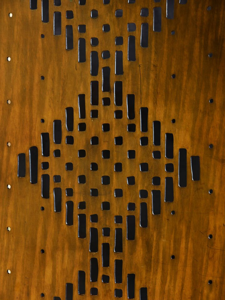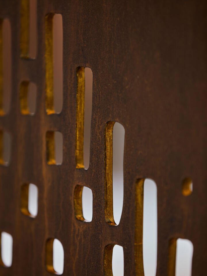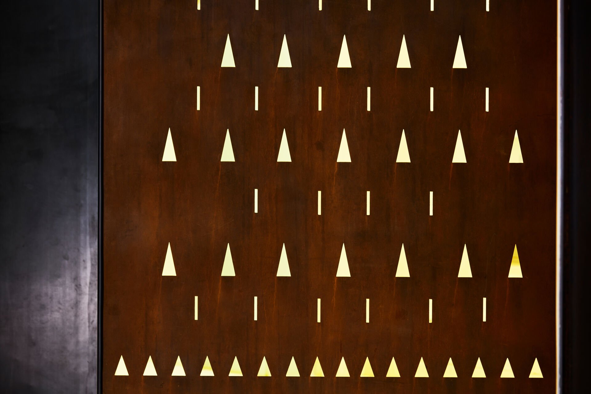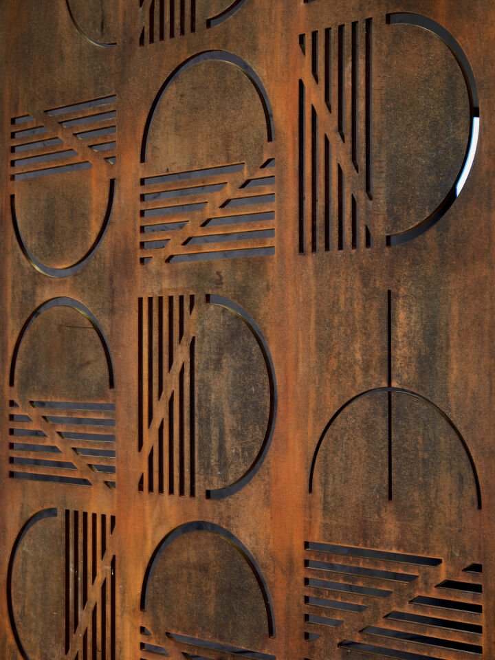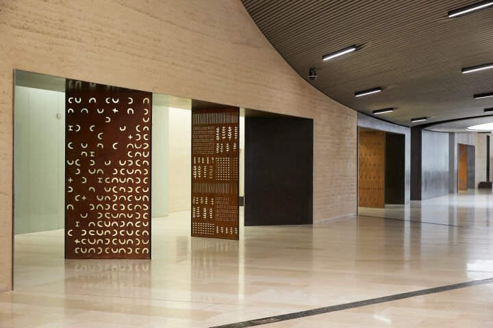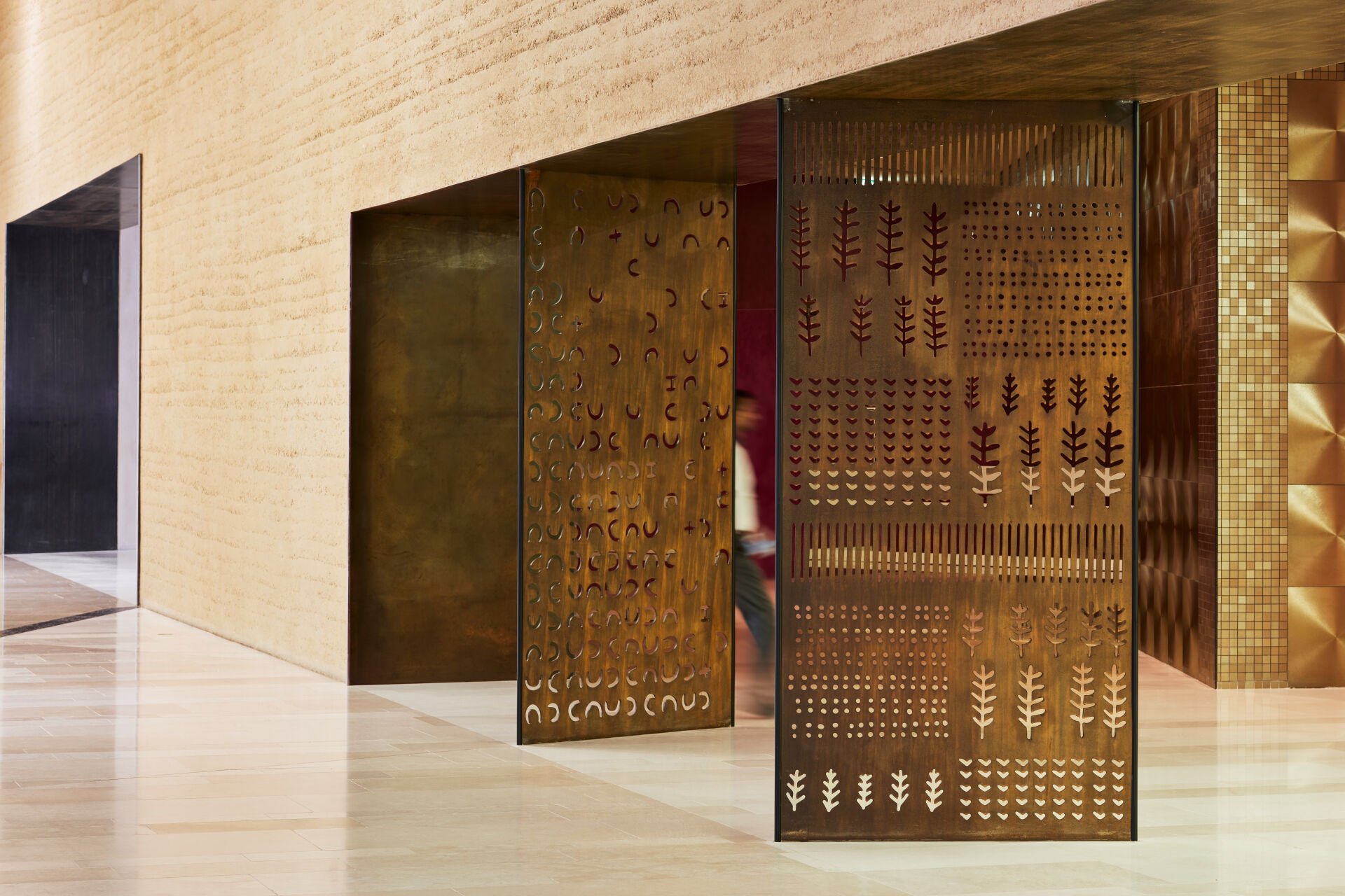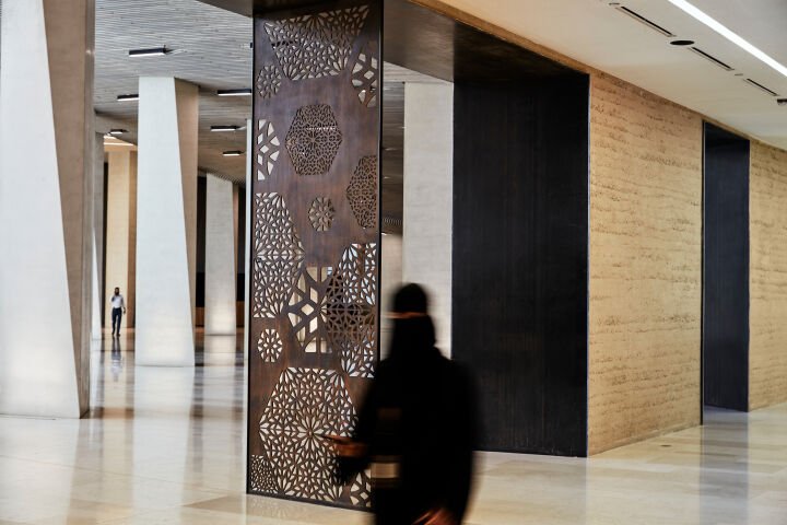 Each of Belinda Smith's seven intricate patterns that perforate the History Gates represents a specific moment in Saudi Arabia's rich past. The gates are specifically sited within Ithra to create a fluid moment of human scale transition between the different ground floor plazas, offering a new experience at each entry and exit point. When read together, the designs create a narrative through time and its corresponding culture and innovation. The number of gates is significant: Haj pilgrims walk around the Kaaba seven times, and seven wells were drilled in search of oil at the site of Ithra; it was at the seventh where oil was struck, leading to it being known today as the Prosperity Well.