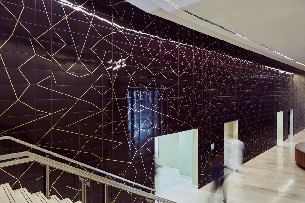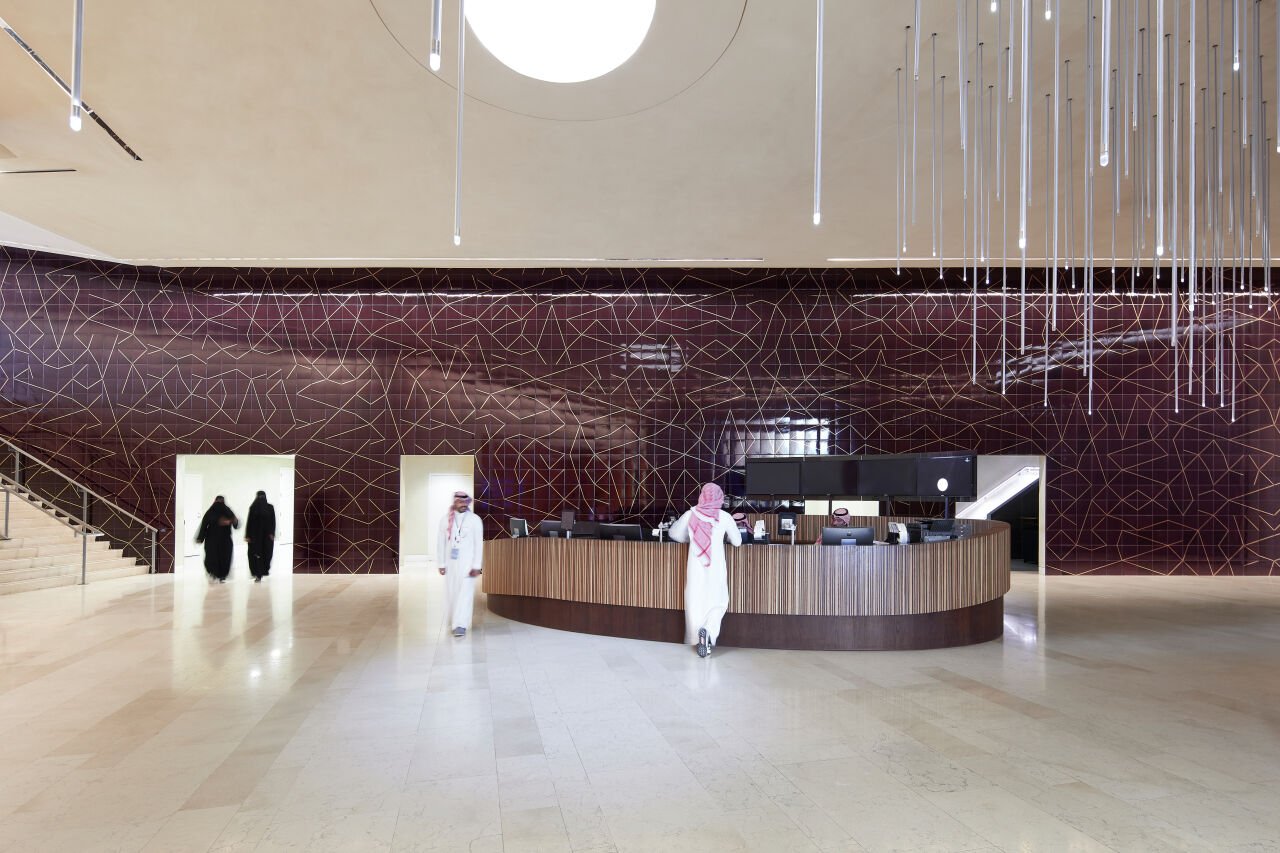 Sweeping across the entire wall surface area of an open, two-floor reception vestibule and cinema entrance at Ithra, the integrated tile artwork Limelight went through several design iterations that culminated in the striking large-scale installation seen today. Creatively directed, designed and fabricated by UAP in Australia, Limelight responded to a set of curatorial criteria that called for exploring a contemporary application of the traditional Iznik quartz tile and an enhancement of the environment of the space. This has been achieved contemporaneously to creating a dialogue with the surrounding context, including the architectural design of the building.