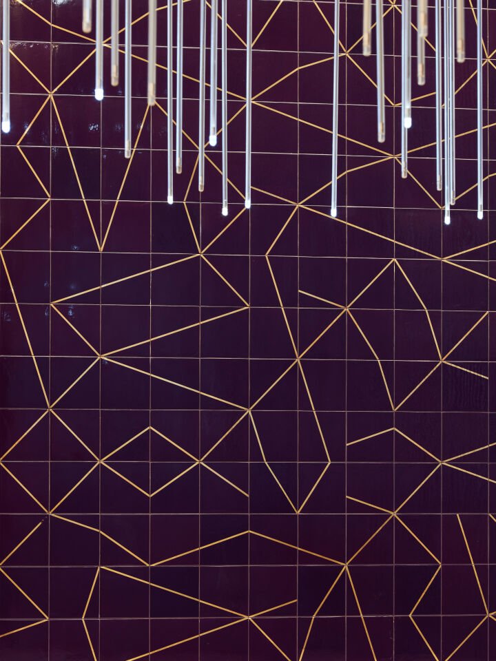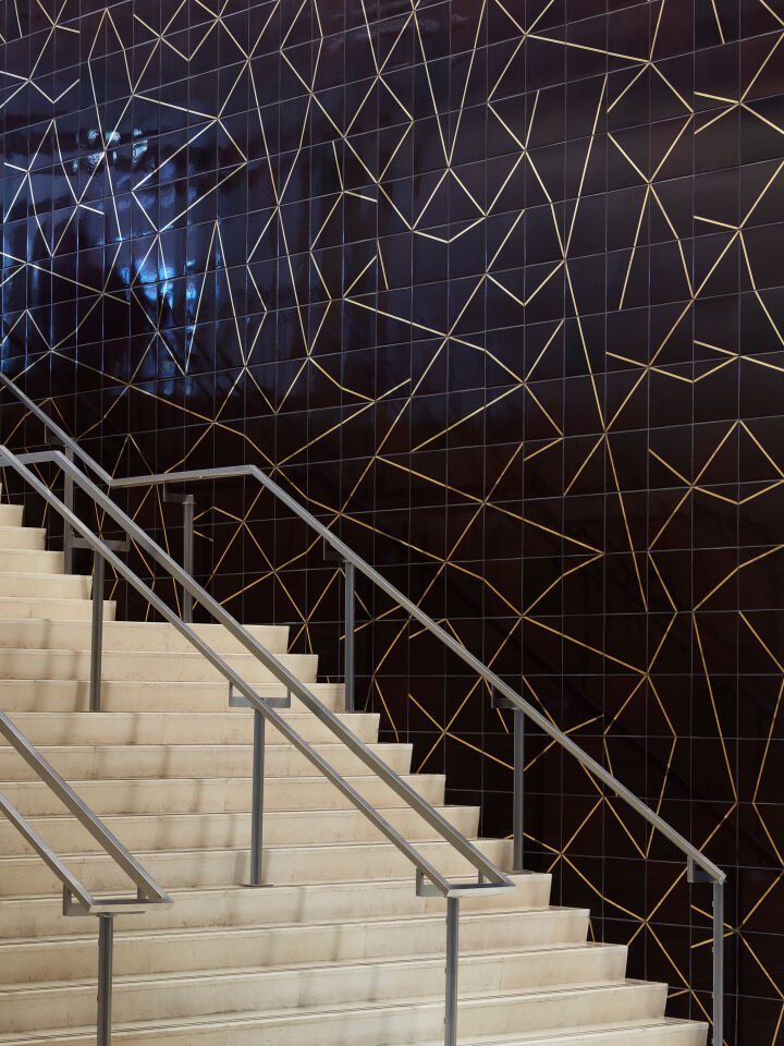 Approximately thirty-five meters long and six meters high, Limelight draws conceptually on the technical perspective of the cinema projector, and how it manipulates, redirects and choreographs light. The design is inspired by the infinite possibilities of light beams extending from a single point, which are then refracted to create a mirage-like composition that radiates across the vast surface of the tiles. Limelight is a strikingly dynamic installation that commands attention. It captures gaze analogous to the allure of a film by its constant altering appearance with light and perspective as it dances across space, spilling onto the floor at times in hued shadows, while temporarily borrowing the reflected silhouettes of people passing by, who subtly and unbeknownst become characters in a montage or vignette.