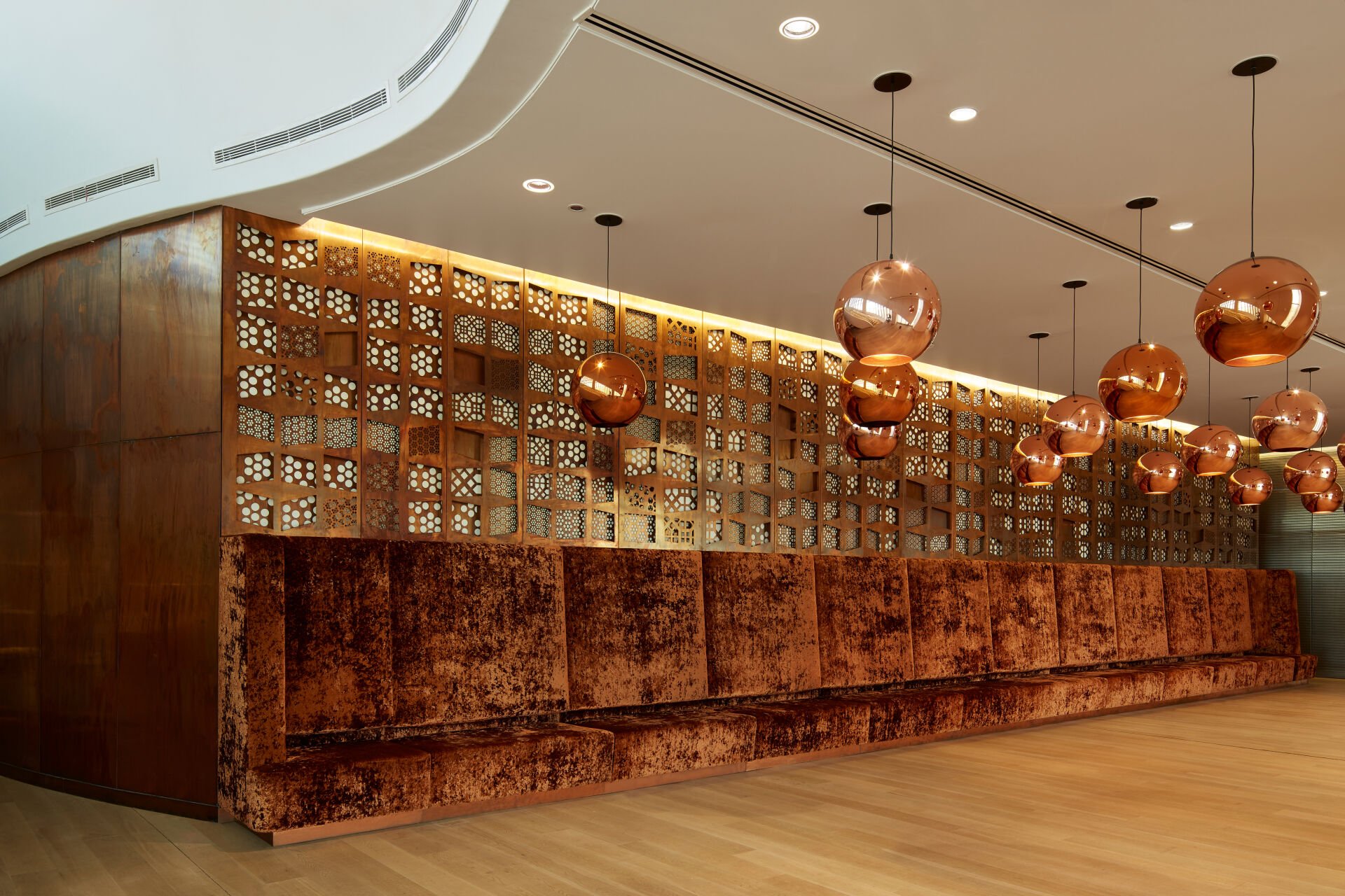 UAP helped Al Turki in the fabrication and installation of Mashrabiya, making Ithara Etala Restaurant an inviting and replenishing environment. Exploring the essential line work and shadow play found in iconic Islamic architectural features, Al Turki has created a contemporary interpretation of the Mashrabiya screens that celebrate respite themes, relaxation, comfort, and beauty. These themes are nurtured in turn with visitors that pass through, rest and nourish themselves within the generous spaces of the Etlala Restaurant.