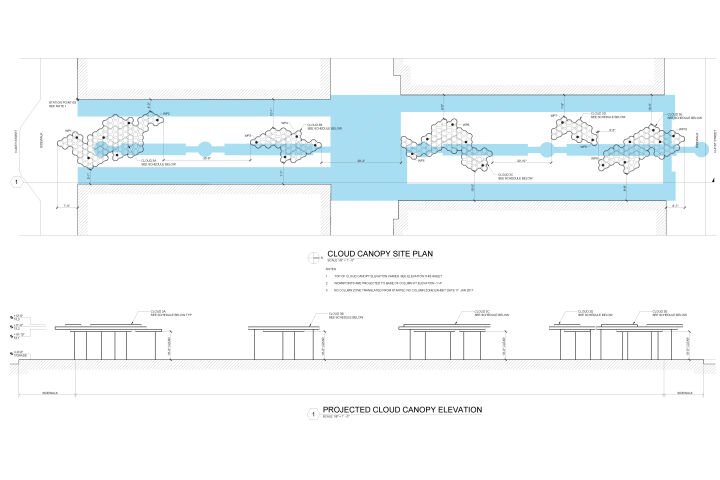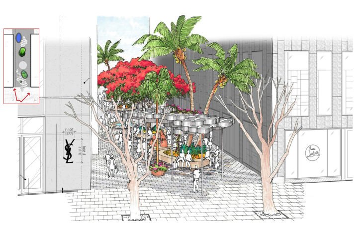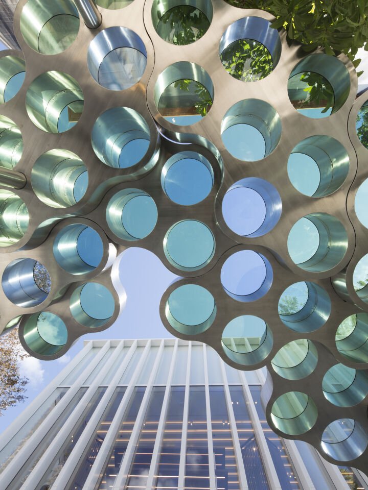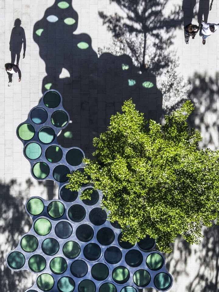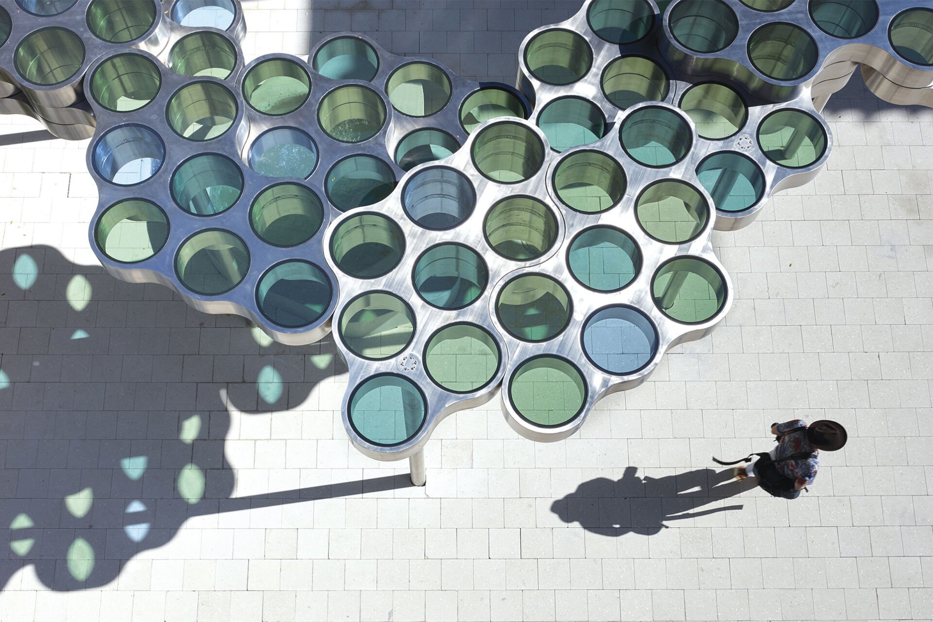 The resulting work titled Nuage, promenade, offers shade, shelter and a revitalized urban experience to the Paseo Ponti in the Miami Design District. The canopy engages with the built environment, casting shadow and light through blue and green coloured glass cells. Native plants that will grow and envelope the work over time create a natural connection with surrounding architecture, offering a new and revitalising encounter with the
