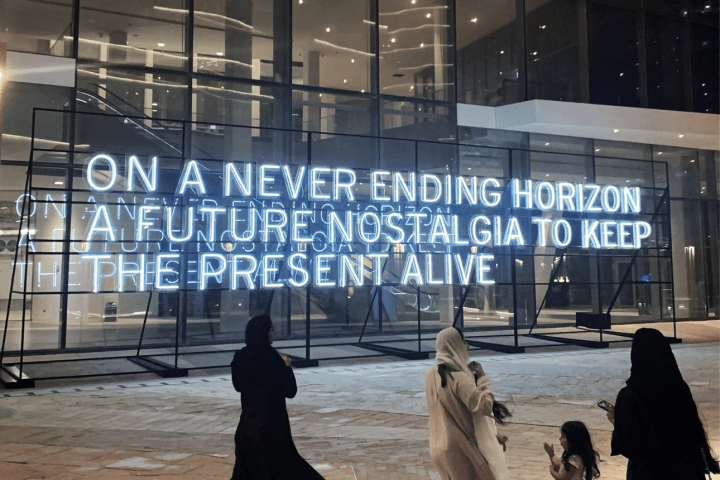 Joël Andrianomearisoa’s On a Never-Ending Horizon, a Future Nostalgia to Keep the Present Alive is a luminous ode to love, hope, and dreams. Crafted from neon lights and metal, the installation transforms the horizon into a symbolic stage for emotions, aspirations, and the fluid passage of time.