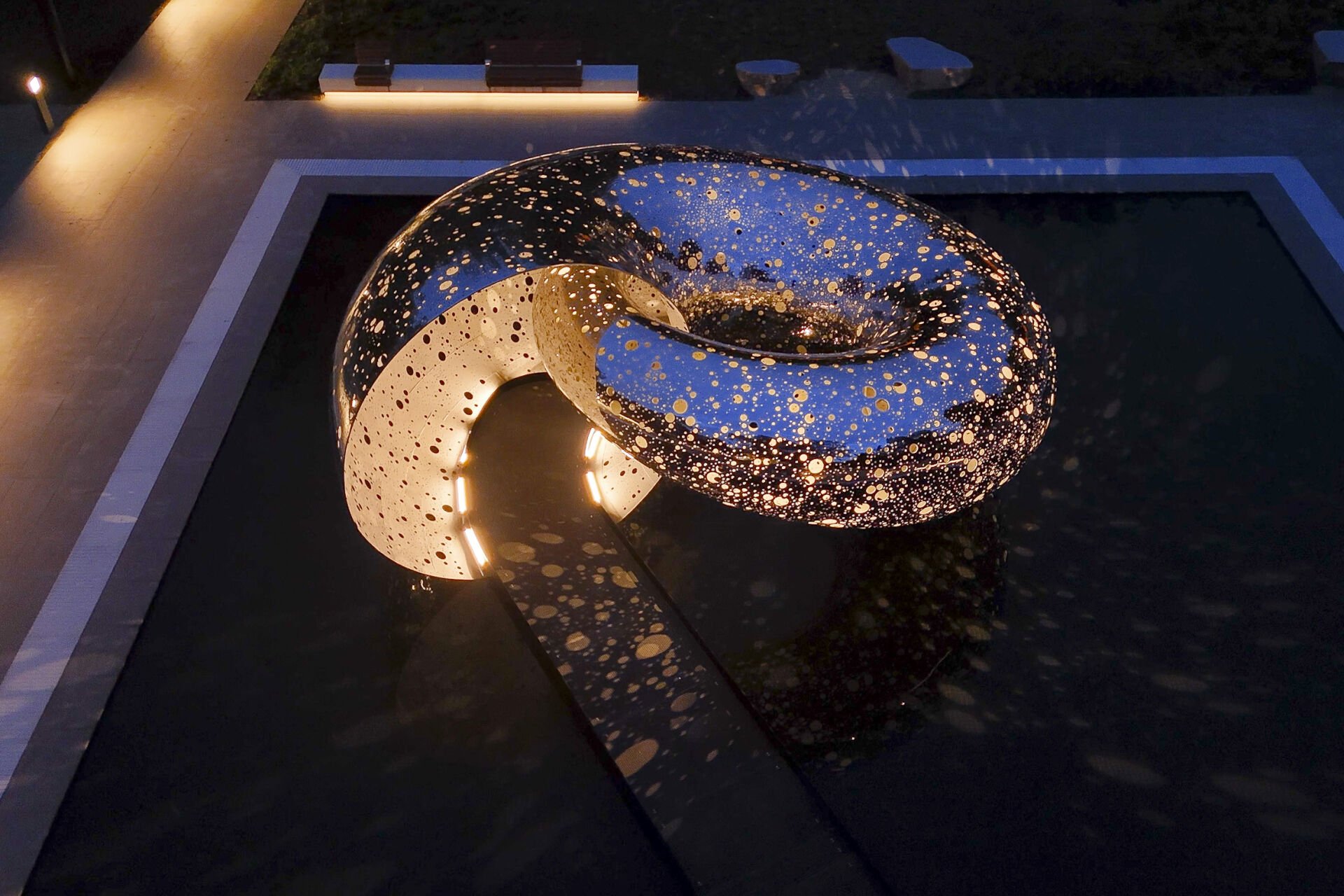 Named after the ancient symbol of a serpent eating its own tail, Ouroboros embodies the eternal cycle, a concept reflected across cultures. Positioned at the entrance to the National Gallery, the sculpture invites visitors to pass through it and into a chamber where light and darkness come together. Thousands of perforations cover its surface, allowing light beams to dance through and transform the space. By day, its mirrored steel reflects the transitory world around it—people, clouds, and birds; by night, it has an internal glow, returning light to its surroundings, a symbol of the continuity and interconnectedness of all things.