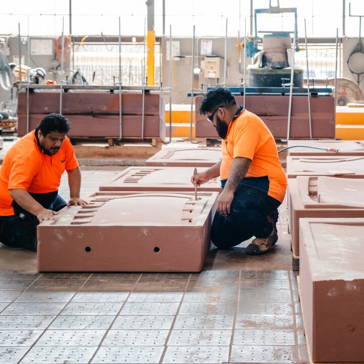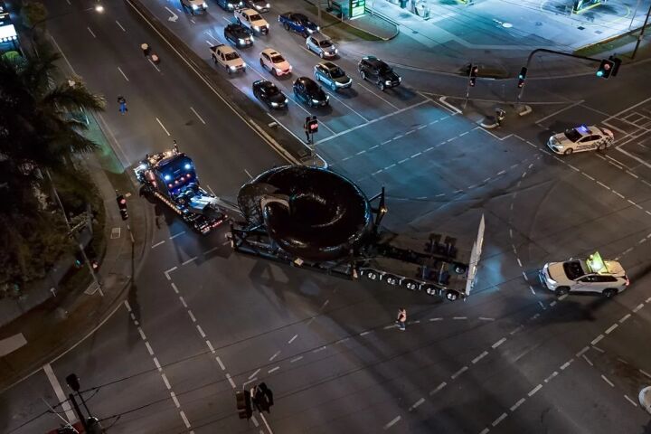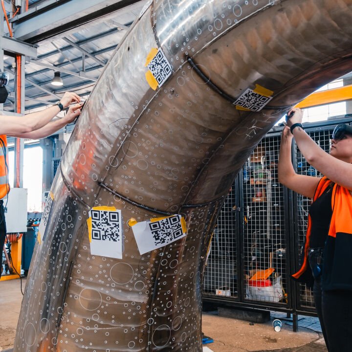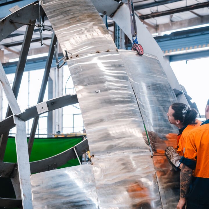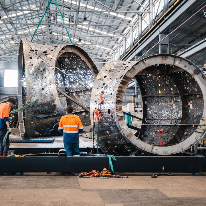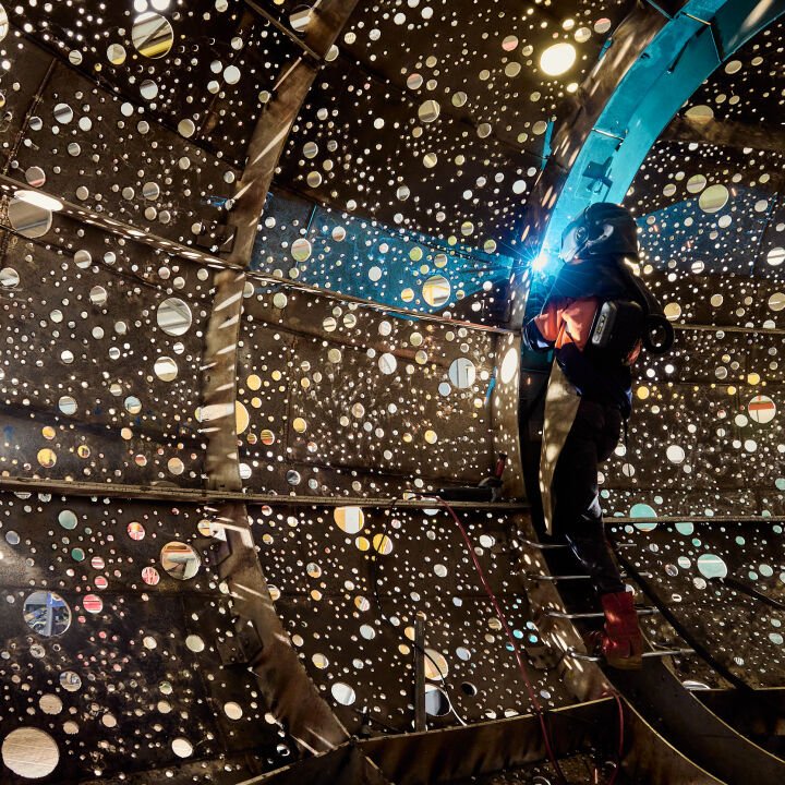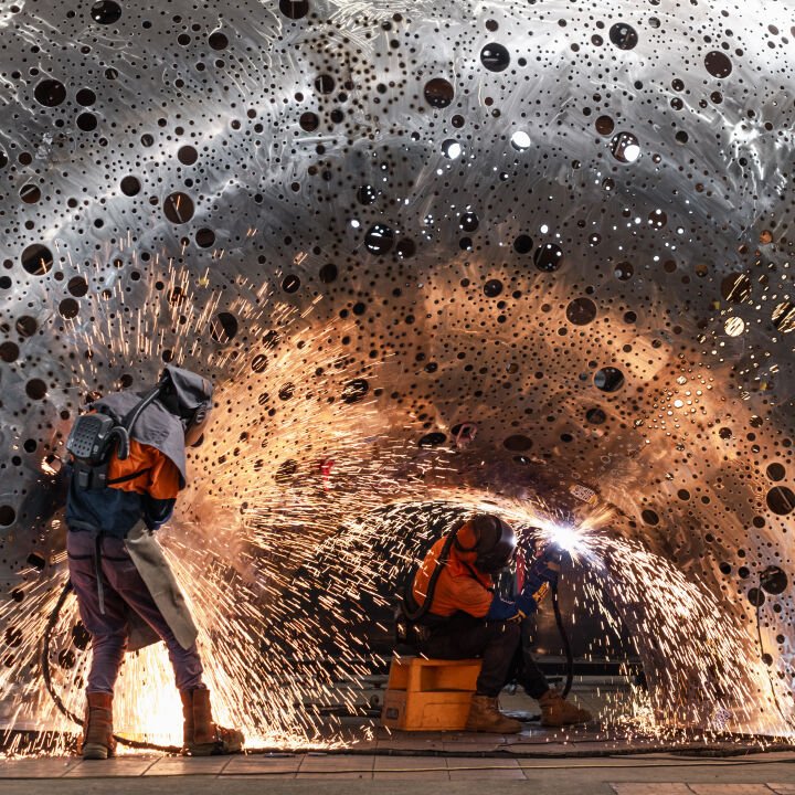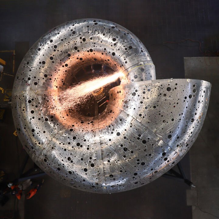 Bringing Ouroboros to life required a massive collaborative effort. Crafted from thirteen tonnes of recycled stainless steel, this artwork represents the most ambitious and largest commission of Lee's career. This chamber of light and shadow was meticulously constructed from eight unique sections, each requiring precise engineering to ensure its shape, weight, and cantilevered form could be realized. Over 60,000 hours of labour and the expertise of countless fabricators, welders, engineers, and finishers culminated in a work that took over two hundred pairs of hands to create.