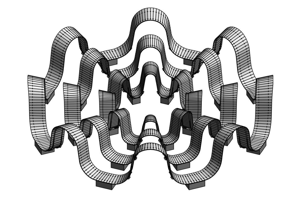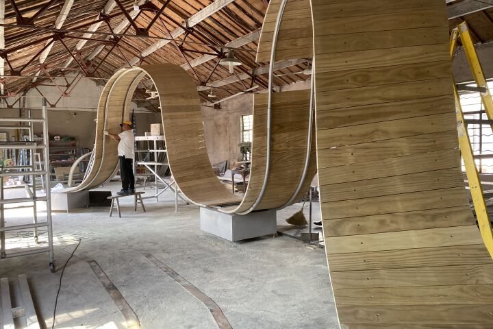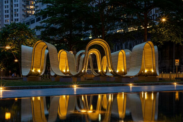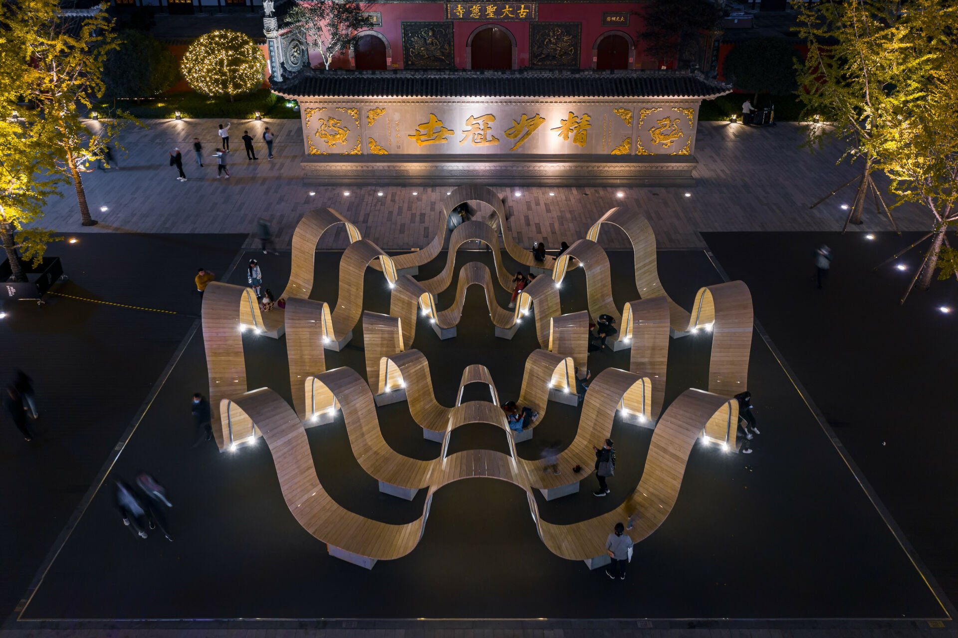 UAP Shanghai worked closely with Paul Cocksedge Studio to explore fabrication methods and materiality suitable for a large-scale touring installation. Fabricated from 1,440 planks of sustainably sourced timber, this 15.2 metre-long installation features ‘waves’ of wood rising to form arches for people to walk through, and curves under to create space for people to sit, lie and relax.