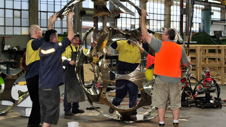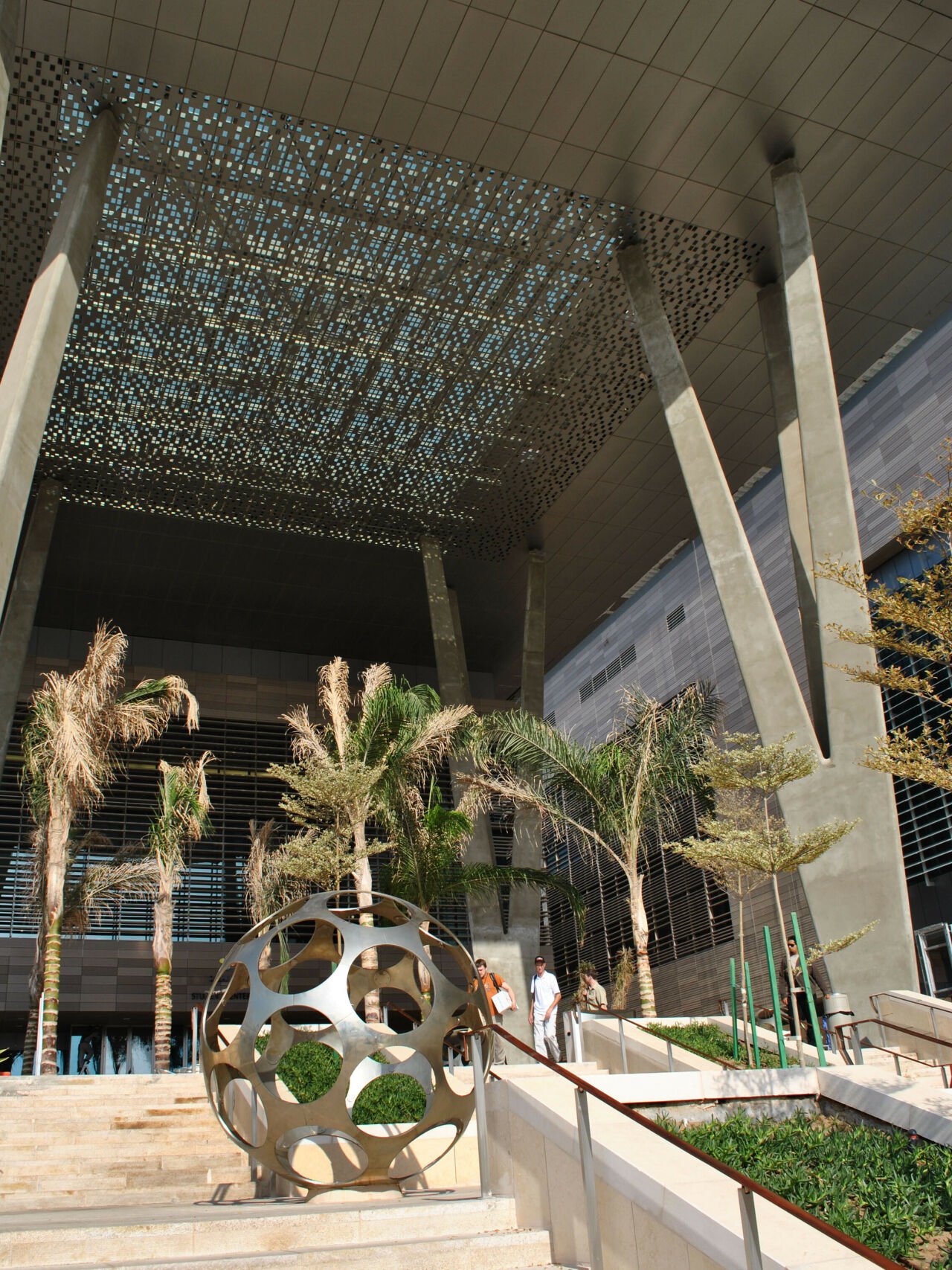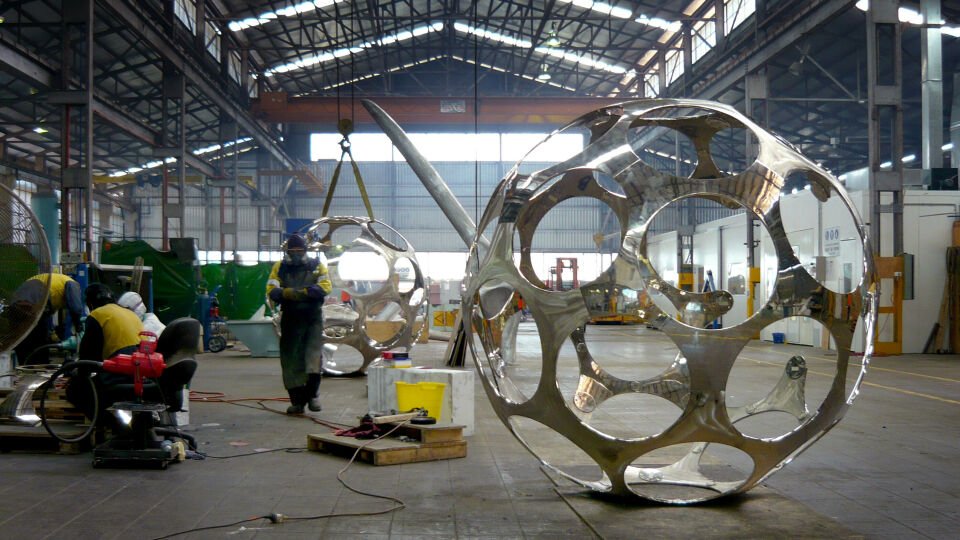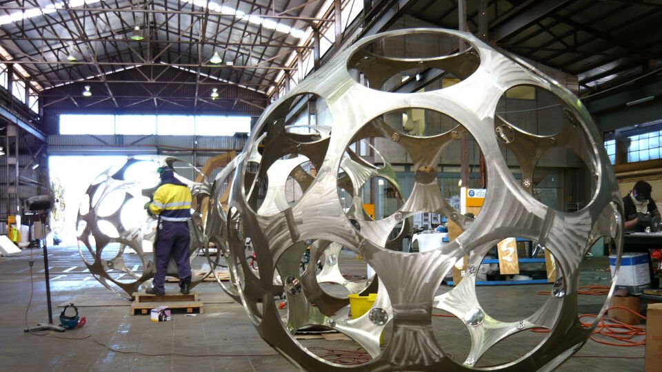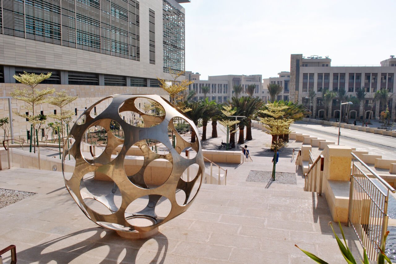 Carsten Höller first presented the Sphere project in Basel’s Museum for Contemporary Art in 1998. He has redeveloped the concept in white brass for the King Abdulla University of Science and Technology (KAUST) International Art Program. Three spheres, each 2.2m in diameter, are positioned at the north entry spine of the university campus. The spheres are based upon a human scale, designed to be entered through the large, round openings.