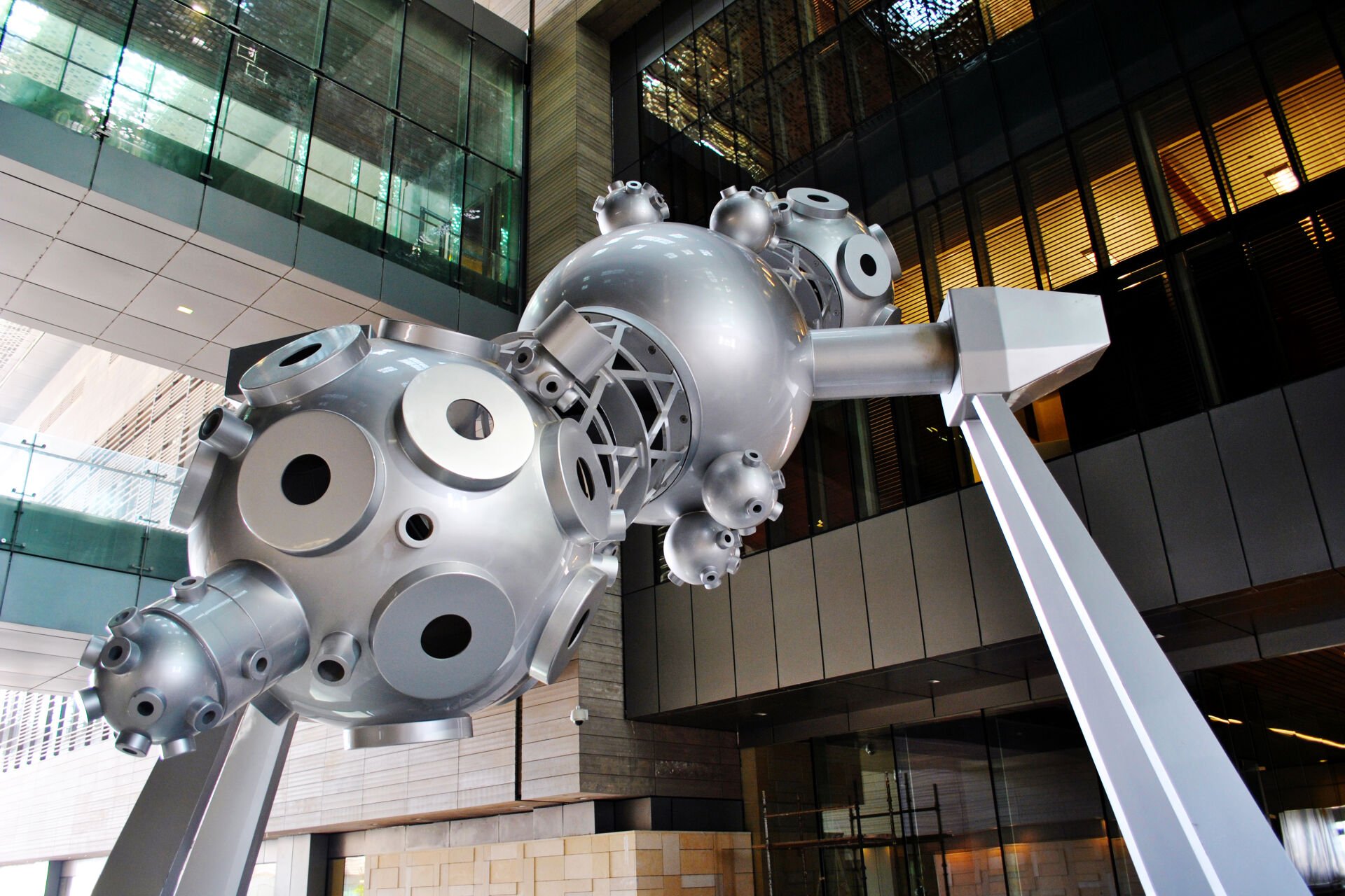 Setting the tone for the ground floor of the University’s research lab, Oliver van den Berg collaborated with UAP Brisbane to deliver Star Projector. Based on an actual apparatus used for projecting an accurate image of the night sky in large planetariums, the 5.7m steel and aluminum structure has all the appearance of futuristic technology without the function. Reduced to pure form, it reflects something of the nature of the human beings who created it.