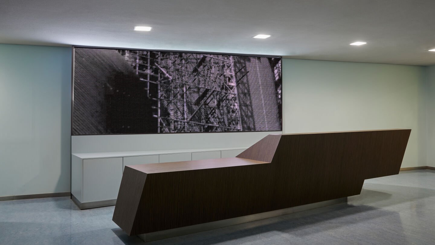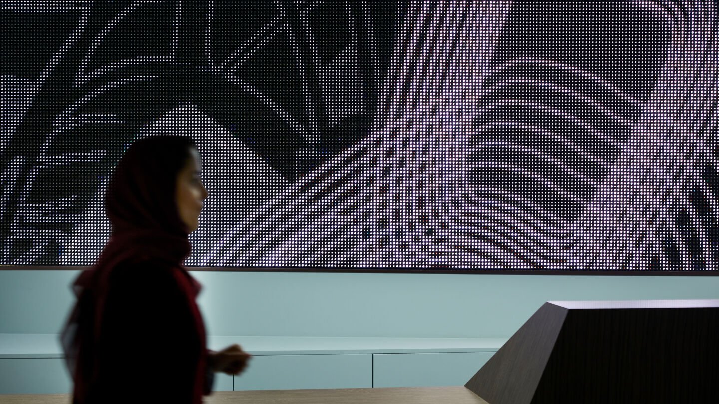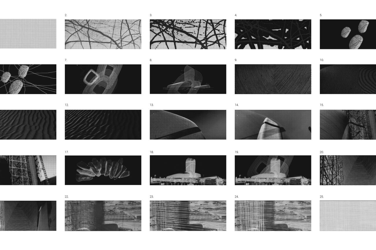 Designed by UAP's Australian studio, the digital video artwork Striations was borne from a curatorial call for a commission that connected with, and explored, the identity of Ithra. The call further identified a need for the commission to capture visitor interest by relating them to their surroundings, including the architectural design of the Center's multiple building components. In response, Striations takes the viewer on a visual journey of the conception of Ithra. The work encapsulates the Center's strong visual connection to place and its surrounding environment through a series of black and white, pixilated still images that are animated to generate an abstracted narrative through time and space. The integration of Snohetta's architectural drawings, combined with an intentionally derivative graphic manipulation, expresses the geometry of the Center's façade and internal framework.
