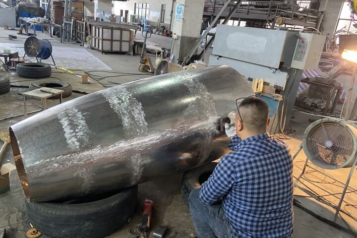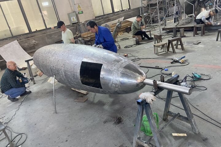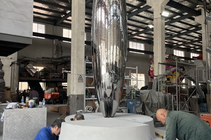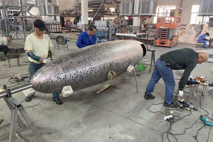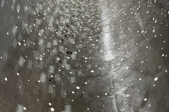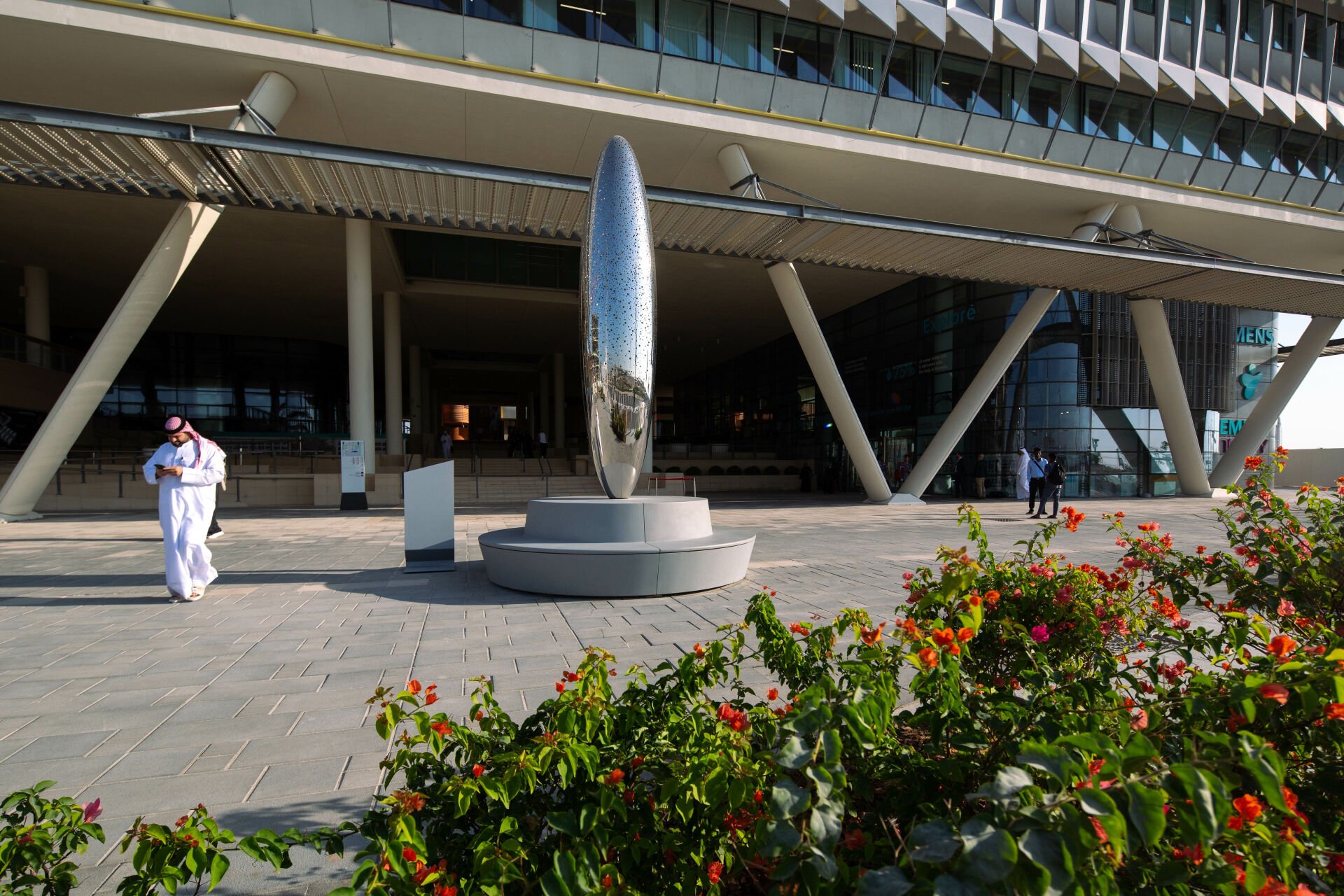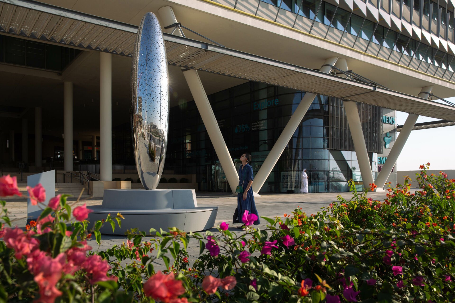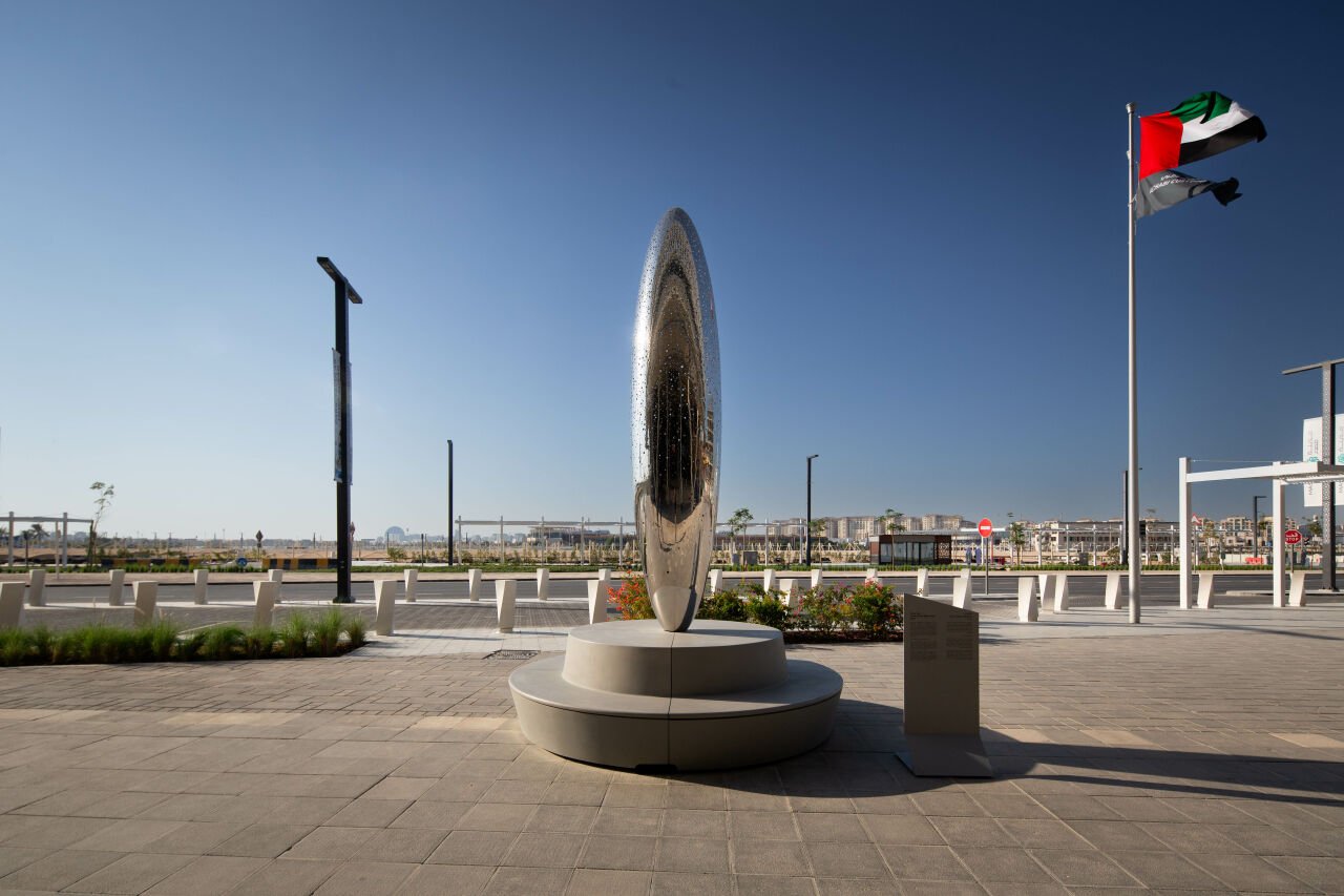 The Tower of Ten Billion Stars is placed at the entrance of the Siemens Energy headquarters in Masdar City. It was chosen as an arrival statement that contemplates the world around us and inspires imagination about our connective futures. This artwork was created by panel-beating stainless steel and drilling thousands of perforations through its shell. Finally, it was mirror polished to give off a reflective surface that, when looked at, warps the reflection due to its shape, combining with the thousands of holes to create a sense of the universe.