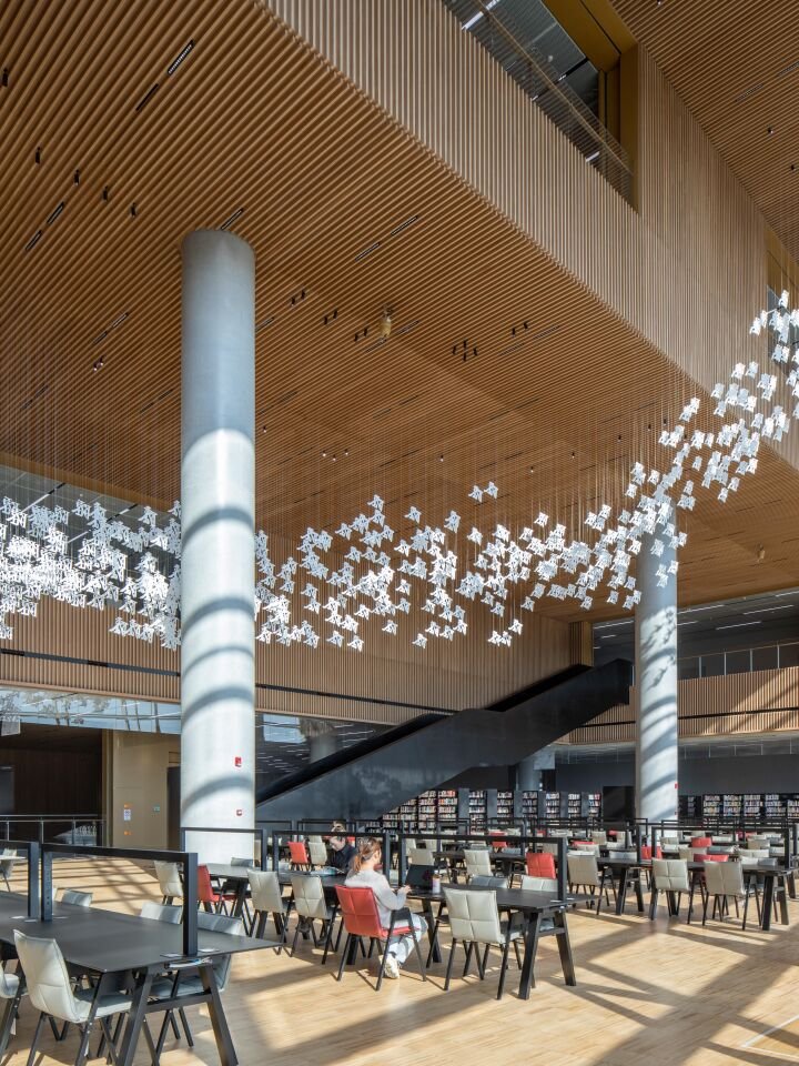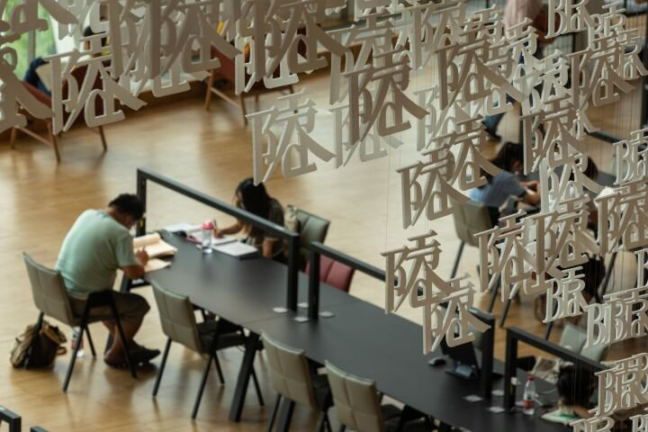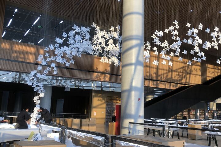 Xu Bing and his studio worked closely with our team in China to deliver Living Word for Shanghai Library East. The artwork comprises over 804 laser-cut acrylic 'birds' in different writing styles of "square word calligraphy" — a new form of writing created by the artist. It is designed to resemble Chinese square characters in English. These iconic figures soar up from the top left corner of the page, inviting readers to free their minds and explore the ideas of writing, Chinese calligraphy, and the interchange of various cultures.