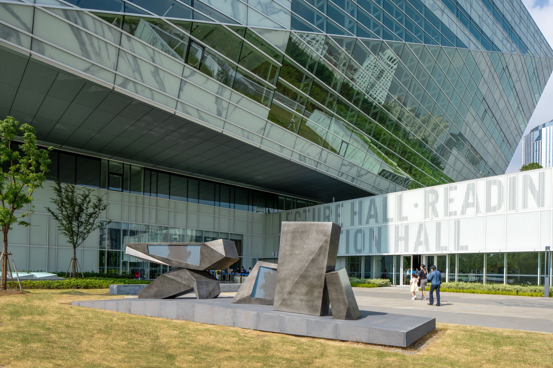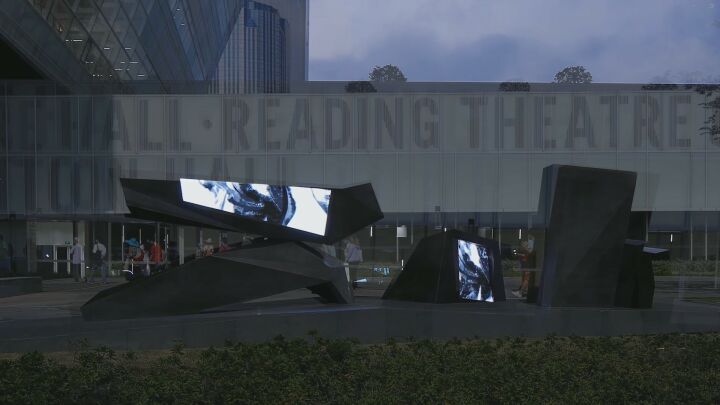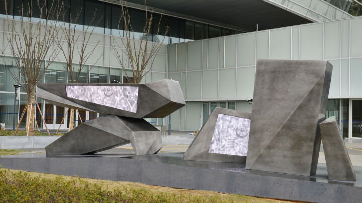From the initial curatorial vision to design development and throughout the manufacturing and installation of the artwork, our team in China worked closely with Zheng Chongbin to deliver the work. Zheng has brought a group of "flying stones" to the Shanghai Library East with the architectural form that inspires the artwork, and its multimedia part integrates ink, technology and natural elements.