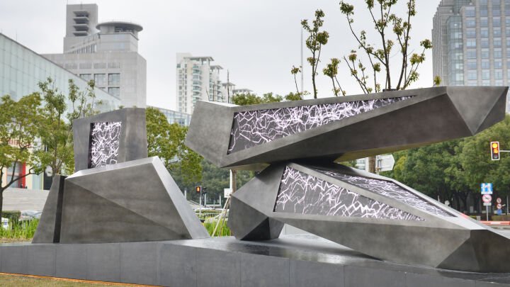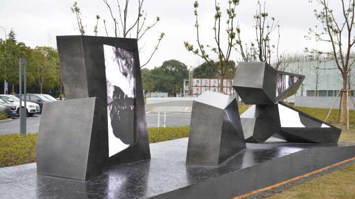 Although Flying Stones is a new form of work for Zheng Chongbin, it continues the thinking that has always been a part of his artistic practice and reflects the artist's recent practice of straddling flat and three-dimensional space: the abstract patterns on the metal surface with special treatment echo the ink and wash that is haloed in his paintings, the geometric folds in the form form form a clever dialogue with the architecture of Shanghai Library East, and the images embedded in it are drawn from the changing landscape of nature and the changing face of technology. The images are drawn from the changing landscape of nature and the changing face of technology. ...... I was also privileged to witness the emotion he injected into this first permanent installation in his hometown during the communication process of the proposal.